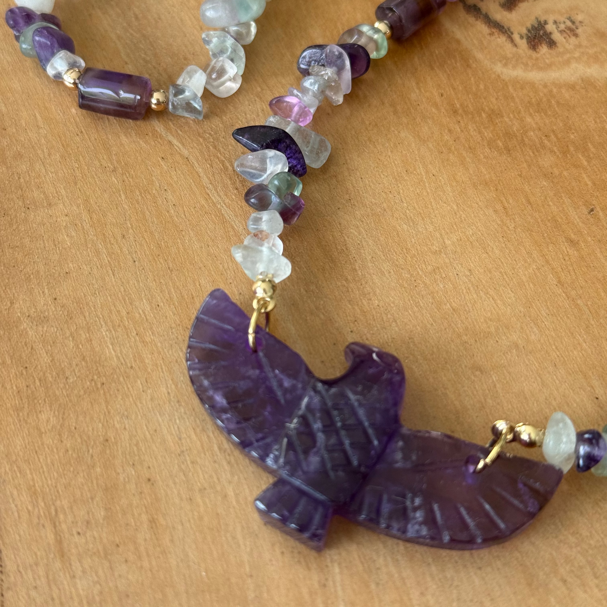 Dije Águila piedra amatista, collar piedra Fluorita, separadores goldfilled y tubos de amatistas.